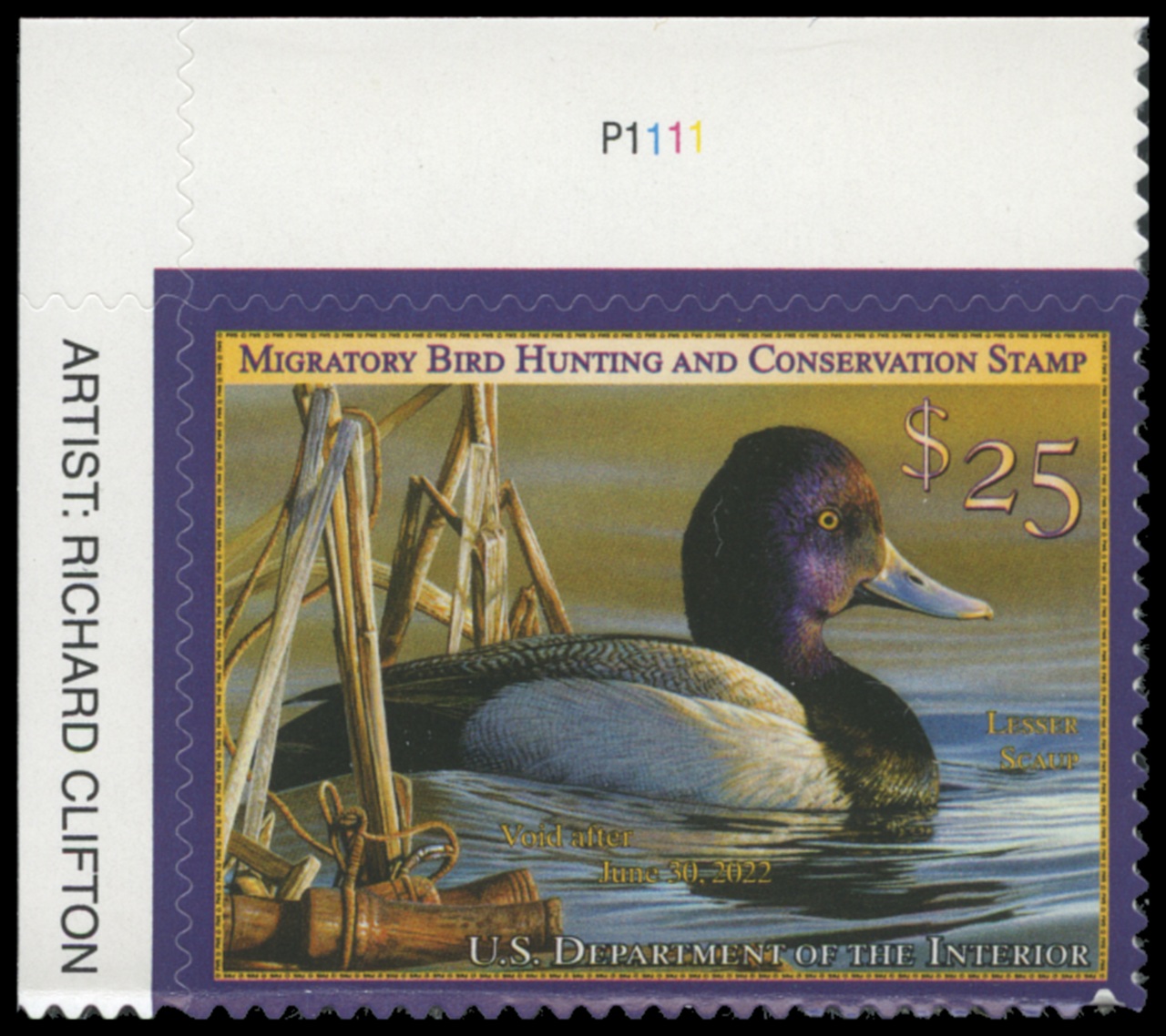 RW88 2021 Federal Duck Stamp. Mint Never Hinged. Fine - Very Fine. Lesser Scaup by Richard Clifton.