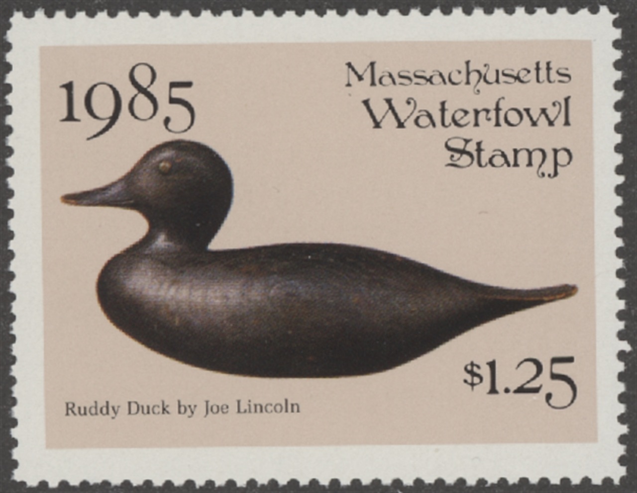 MA12 1985 State Duck Stamp. Mint Never Hinged. Very Fine. Ruddy Duck by Randy Julius.