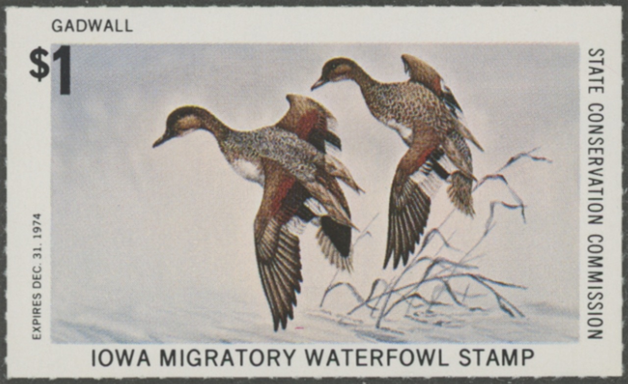 IA3 1974 State Duck Stamp. Mint Never Hinged. Very Fine. Pair of Gadwalls by James Landerberger.