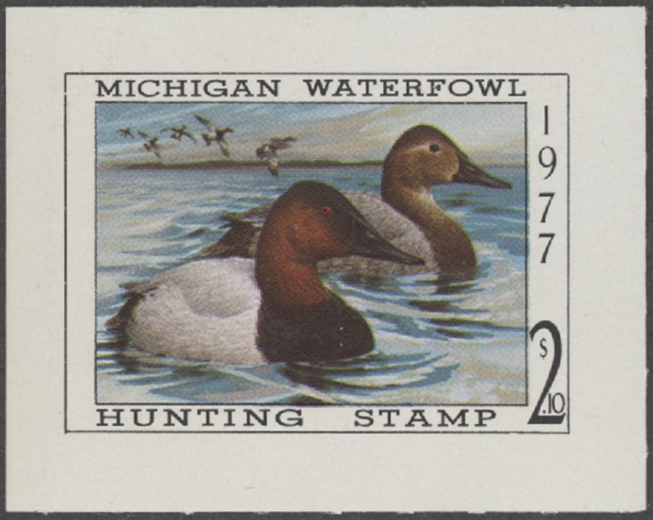 MI2 1977 State Duck Stamp. Mint Never Hinged. Very Fine. Canvasbacks by Larry Hayden.