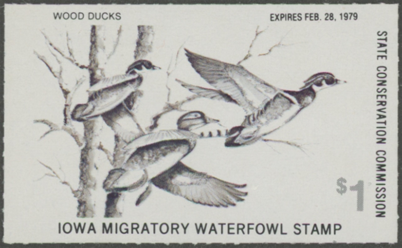 IA7 1978 State Duck Stamp. Mint Never Hinged. Very Fine. Wood Ducks by Nick Klepinger.