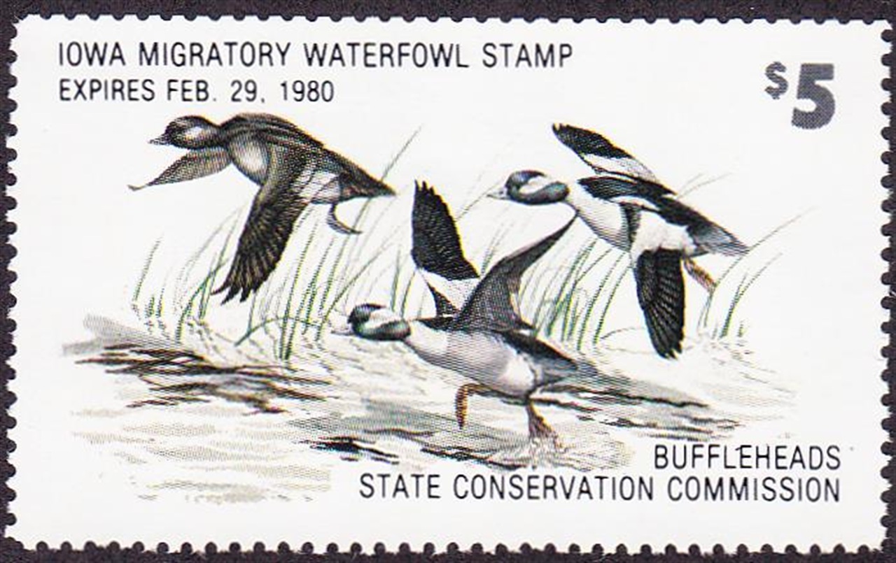 IA8 1979 State Duck Stamp. Mint. Lightly Hinged. Very Fine. Buffleheads by Andrew Peters.