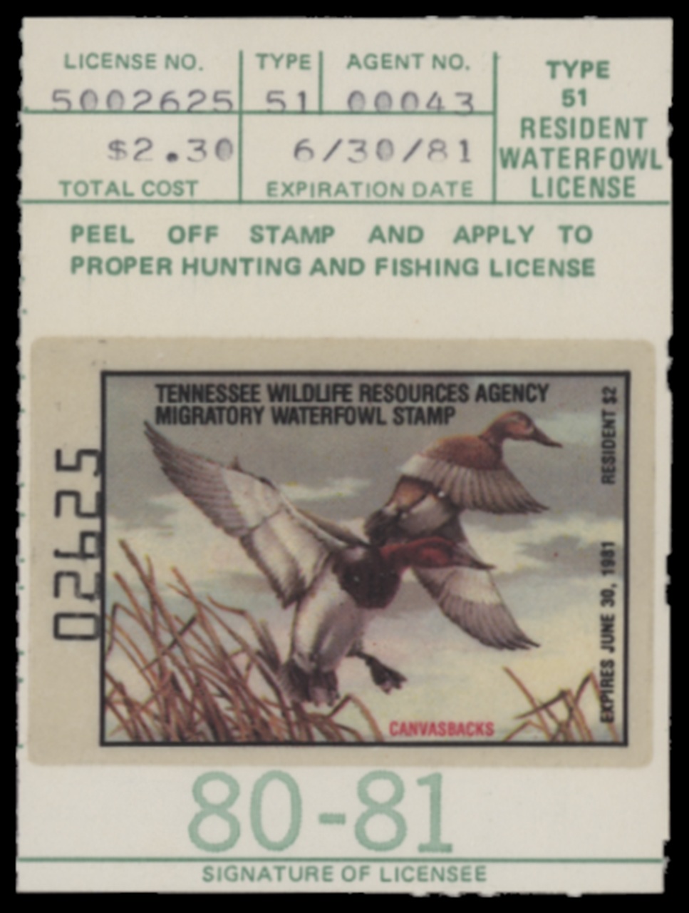 TN2 1980 State Duck Stamp. Mint Never Hinged. Very Fine. Cavasbacks by Phillip Crowe.