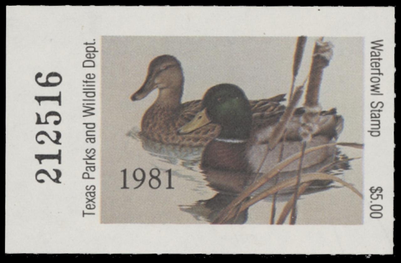 TX1 1981 State Duck Stamp. Mint Never Hinged. Very Fine. Mallard Pair by Larry Hayden.