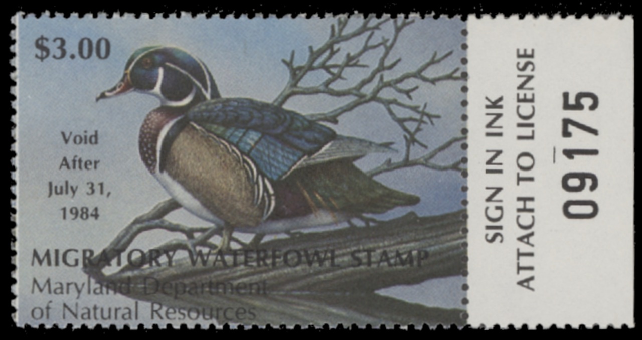 MD10 1983 State Duck Stamp. Mint Never Hinged. Very Fine. Wood Duck by Roger E. Lent.