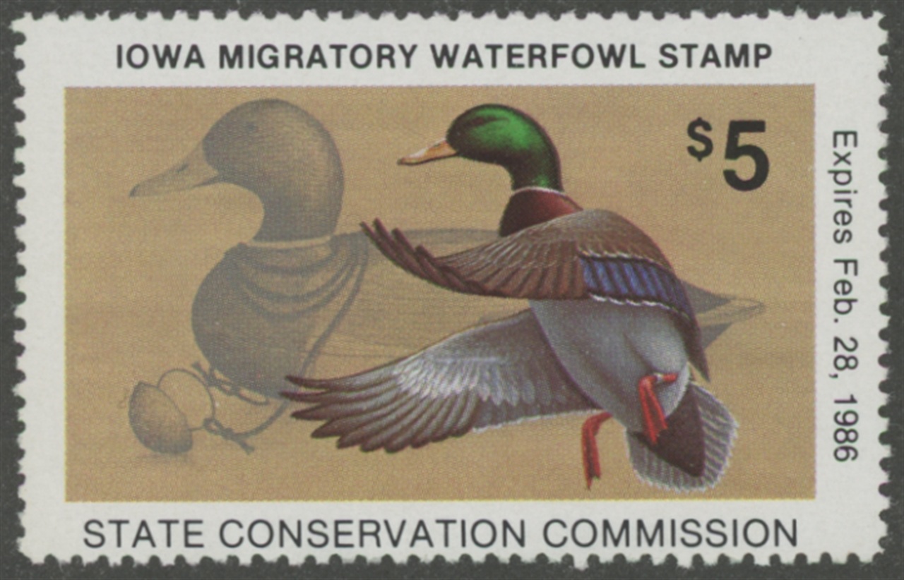 IA14 1985 State Duck Stamp. Mint Never Hinged. Very Fine. Drake Mallard and Decoy by Jack Hahn.