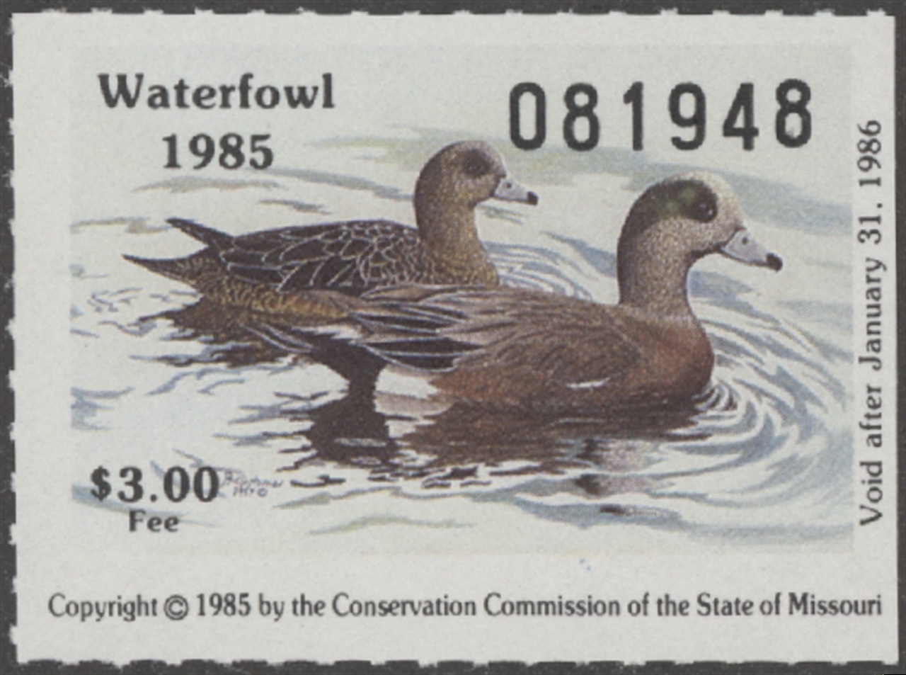 MO7 1985 State Duck Stamp. Mint Never Hinged. Very Fine. American WIdgeon by Ron Clayton.