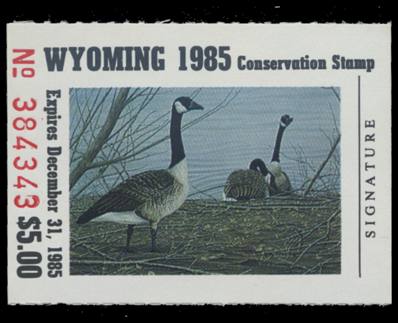 WY2 1985 State Duck Stamp. Mint Never Hinged. Very Fine. Canada Geese by Robert Kusserow.