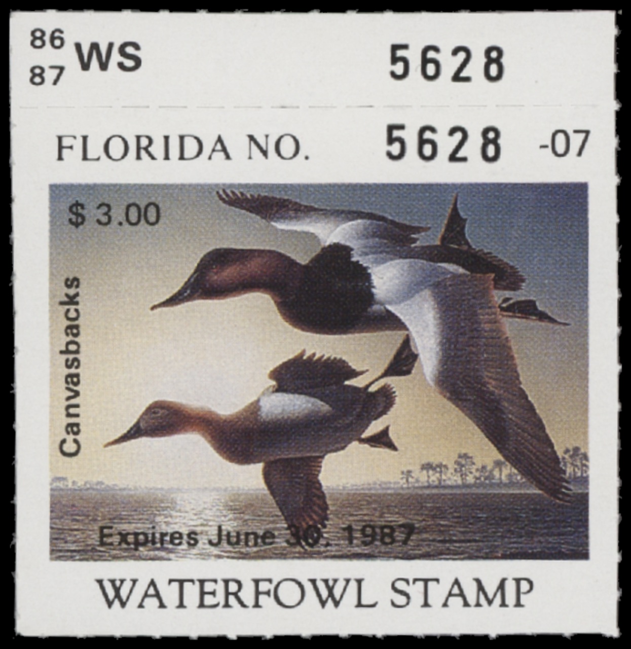 FL8 1986 State Duck Stamp. Mint Never Hinged. Very Fine. Canvasbacks by Robert Steiner.