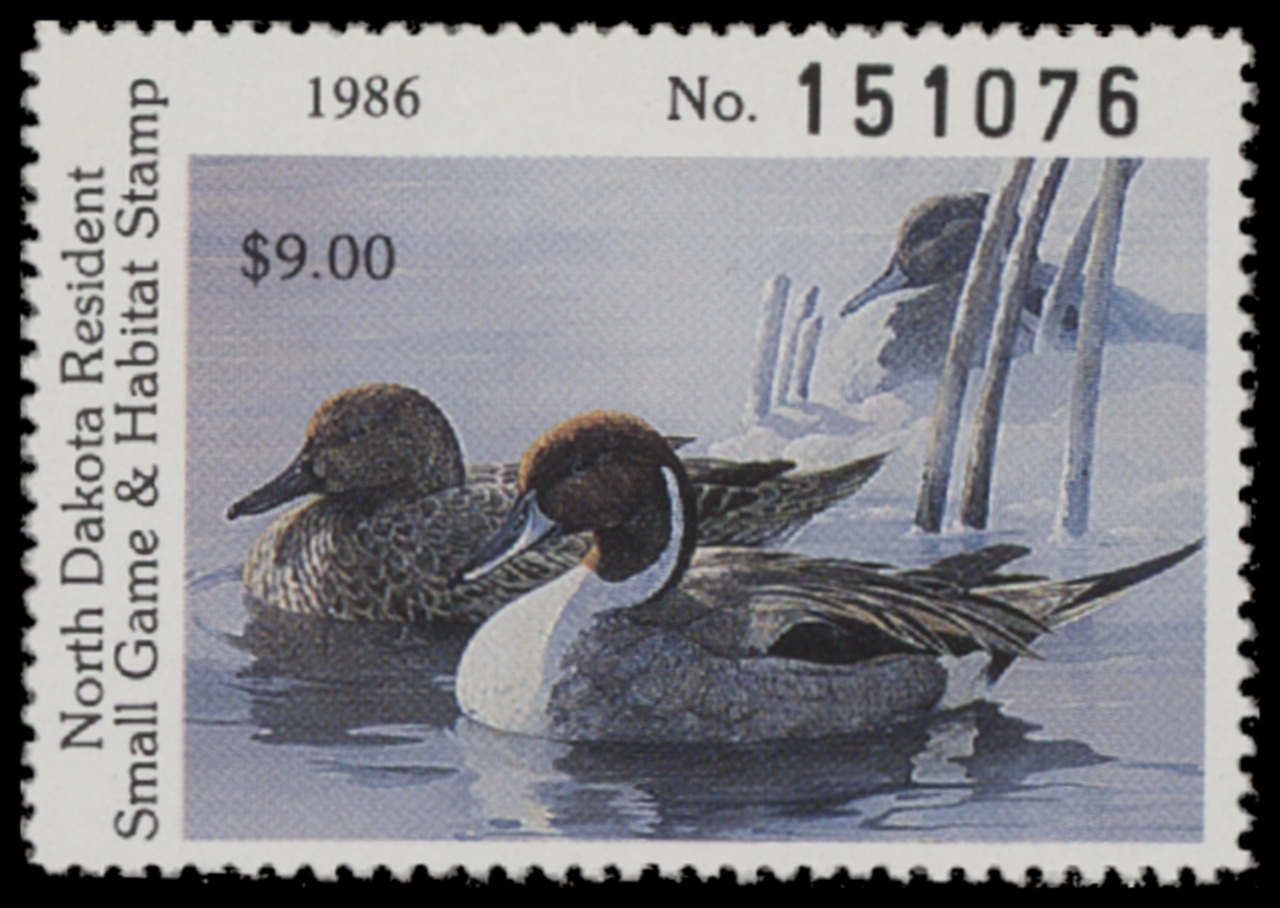 ND5 1986 State Duck Stamp. Mint Never Hinged. Very Fine. Pintails by Mario Fernandez.