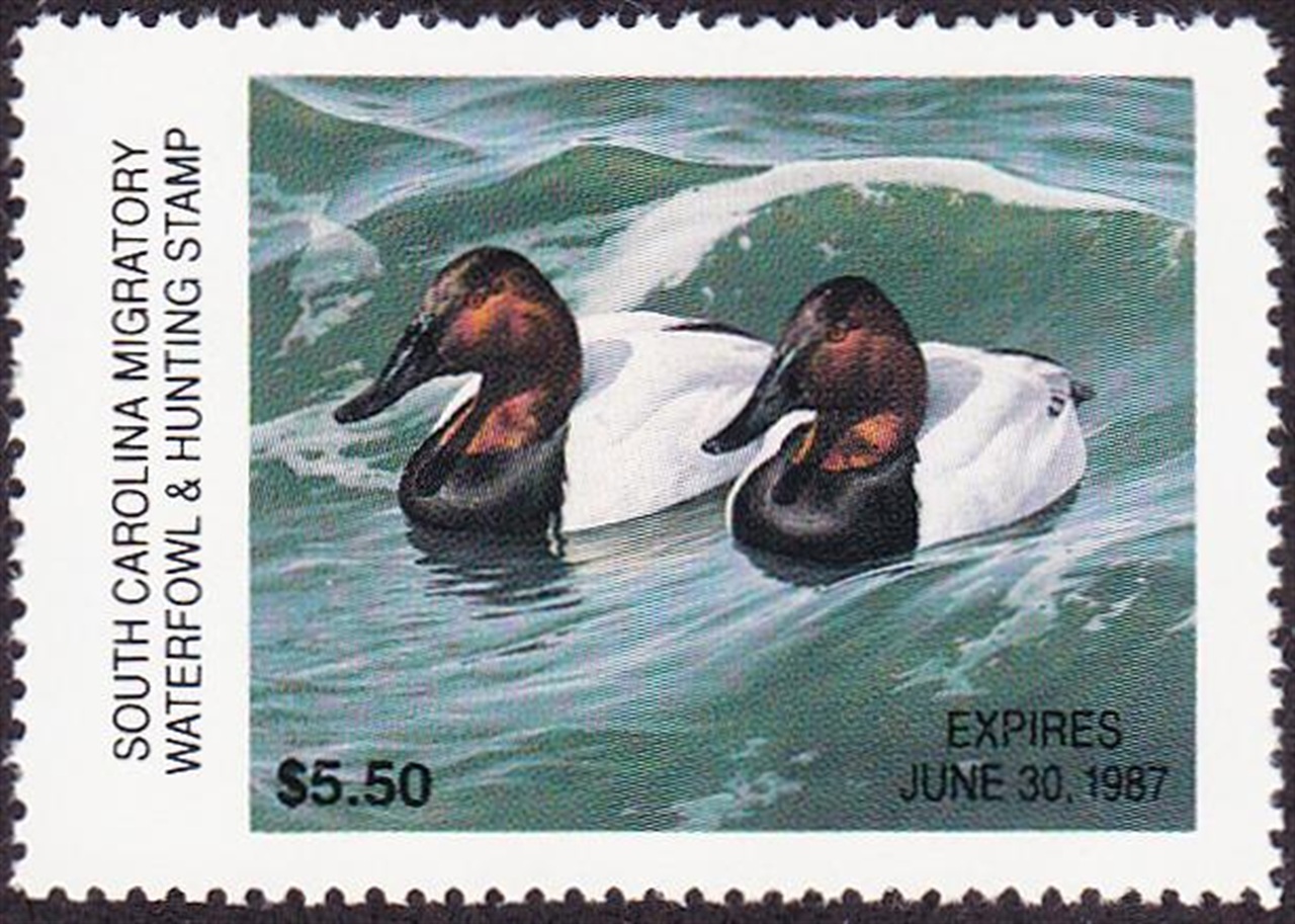 SC6 1986 State Duck Stamp. Mint Never Hinged. Fine - Very Fine. Canvasback by Daniel Smith.
