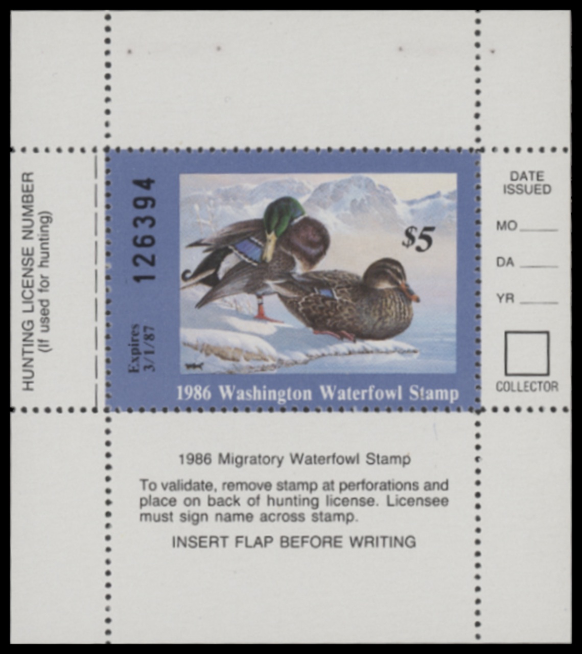 WA1 1986 State Duck Stamp. Mint Never Hinged. Very Fine. Mallards by Keith Warrick.
