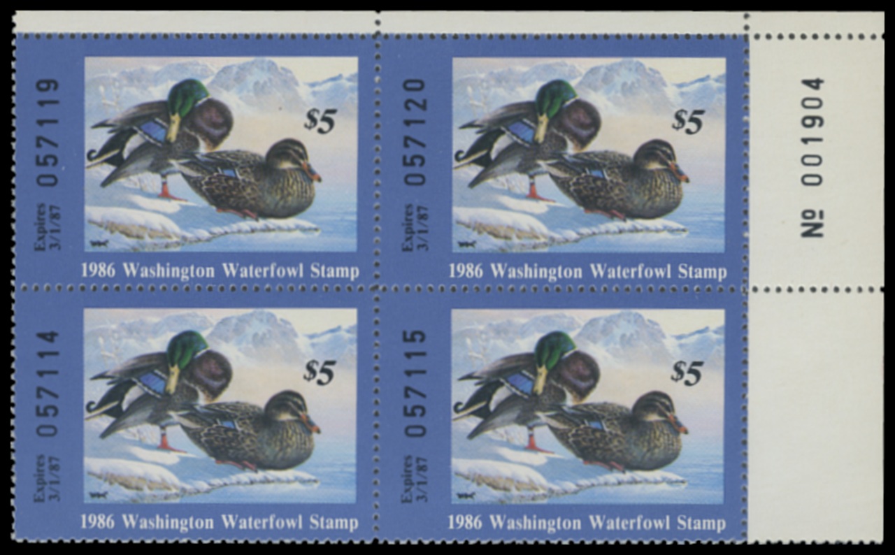 WA1 1986 State Duck Stamp. Mint Never Hinged. Very Fine. Mallards by Keith Warrick.
