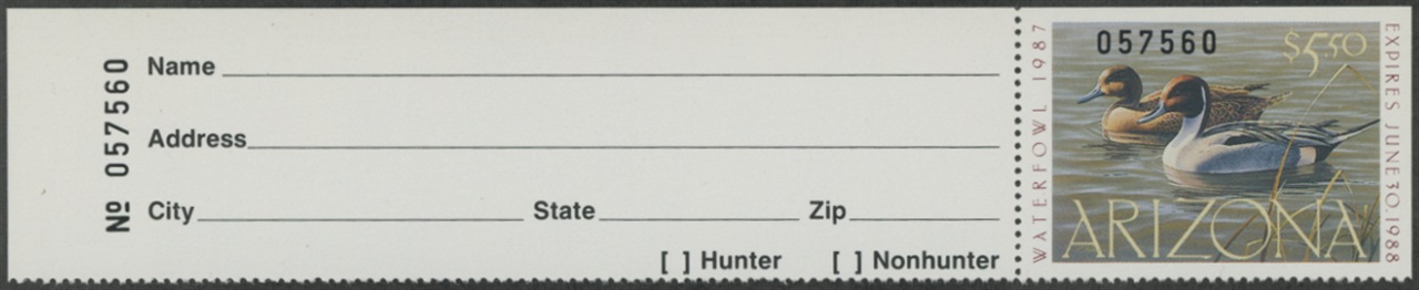 AZ1A 1987 State Duck Stamp. Mint Never Hinged. Very Fine. Hunter Type with Full Tab. Pintails by Daniel Smith.