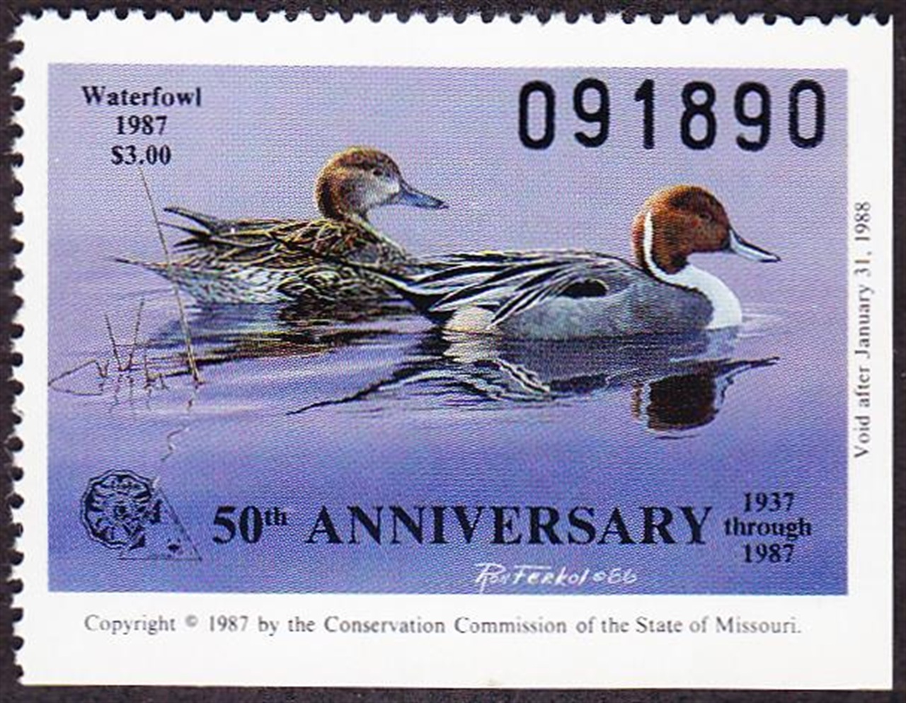 MO9 1987 State Duck Stamp. Mint Never Hinged. Fine - Very Fine. Pintails by Ron Ferkol