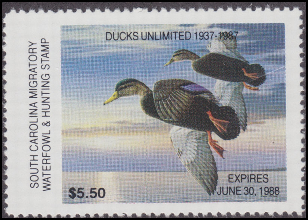 SC7 1987 State Duck Stamp. Mint Never Hinged. Very Fine. Black Ducks by Steven Dillard.