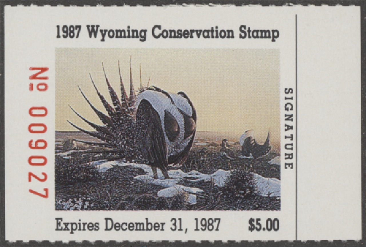 WY4 1987 State Duck Stamp. Mint Never Hinged. Very Fine. Sage Grouse by Ted Feely.