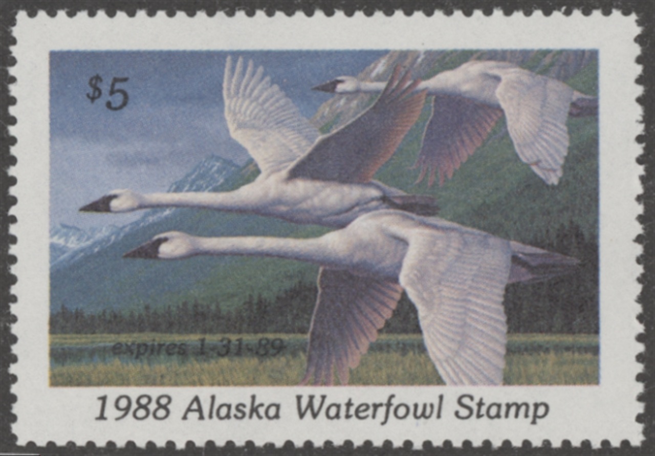 AK4 1988 State Duck Stamp. Mint Never Hinged. Very Fine. Trumpeter Swans by Jim Beaudoin.
