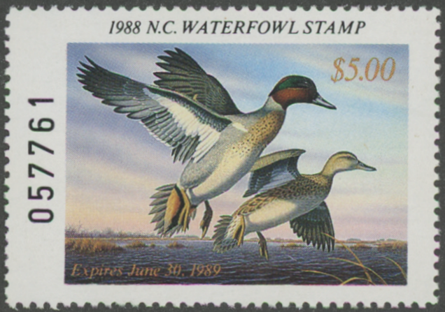 NC6 1988 State Duck Stamp. Mint Never Hinged. Very Fine.