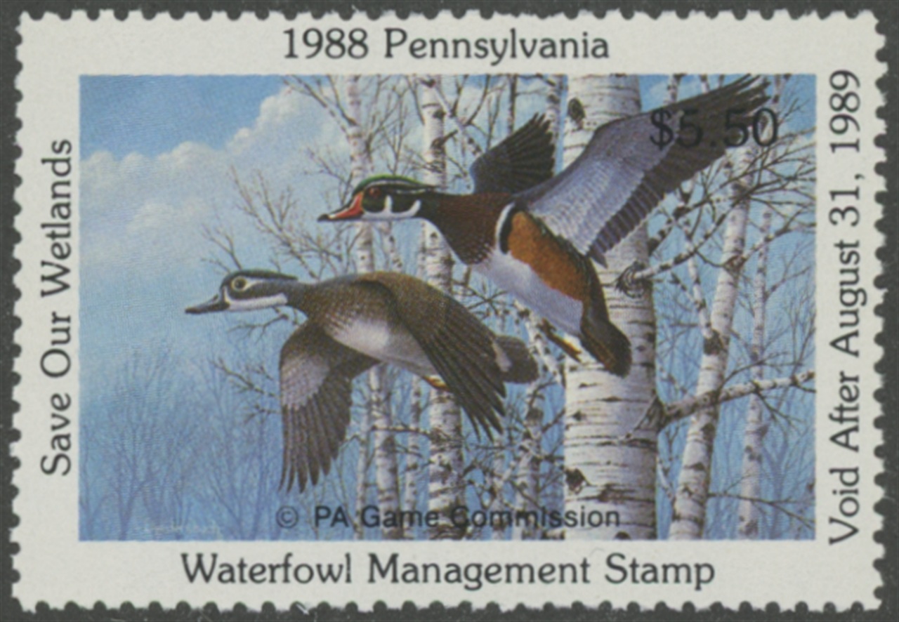 PA6 1988 State Duck Stamp. Mint Never Hinged. Very Fine. Wood Ducks by John Hendersbach.