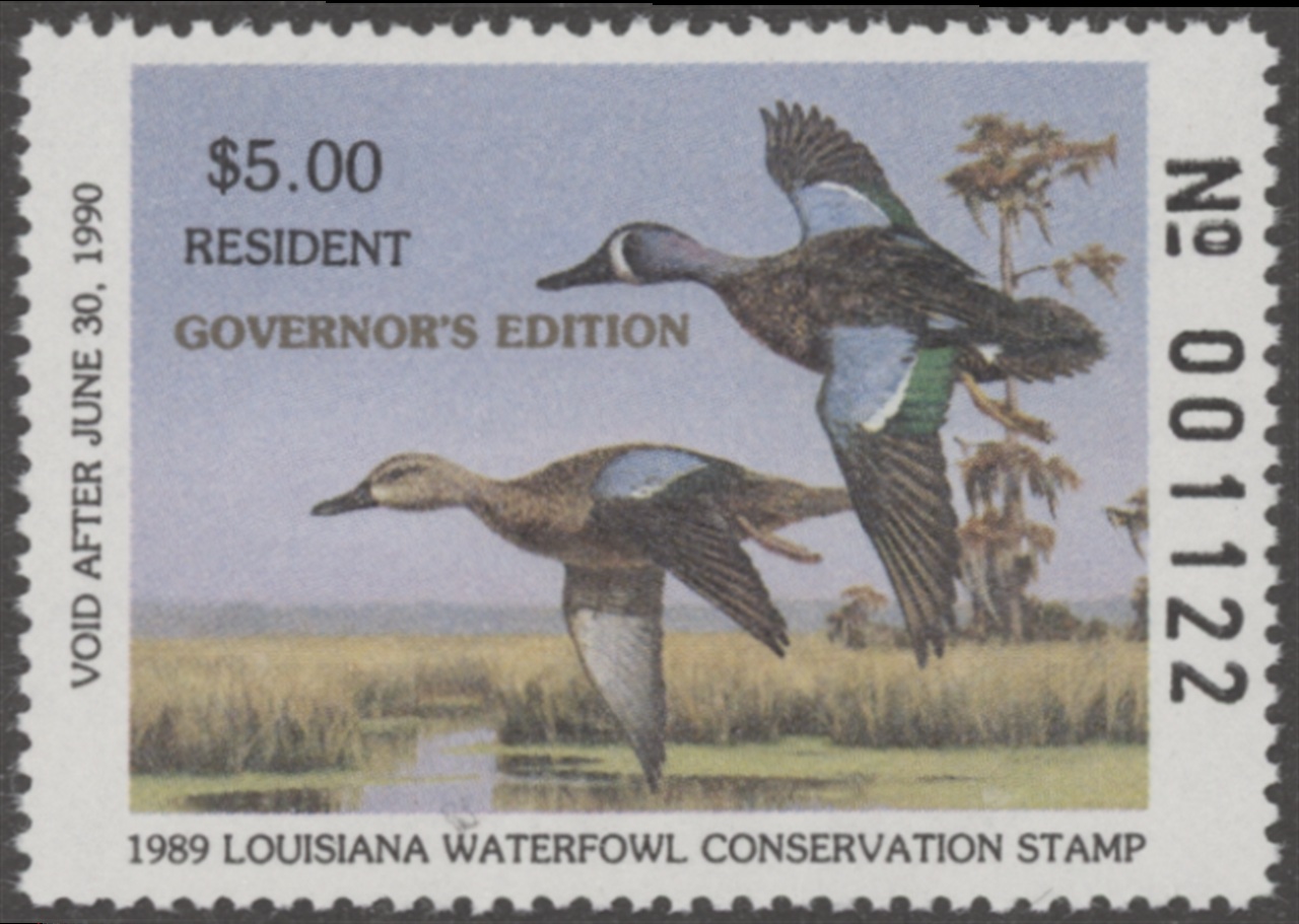 LA1G/LA1GA 1989 State Duck Stamp Governor's Edition. Resident and Non Resident with Matching Serial Numbers. Mint Never Hinged. Very Fine. Blue-wing Teal by David Noll.