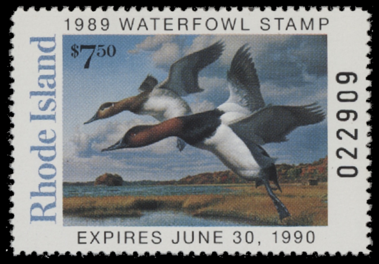 RI1 1989 State Duck Stamp. Mint Never Hinged. Very Fine. Canvasbacks by Robert Steiner.