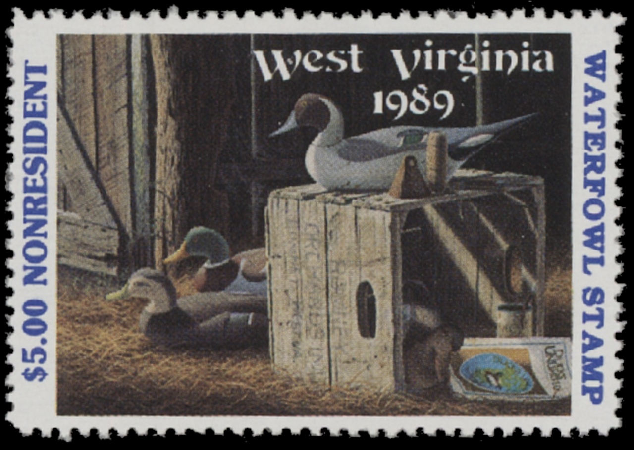WV3 1989 State Duck Stamp. Non-resident. Mint Never Hinged. Very Fine. Pintail Decoy by Ronald J. Louque.