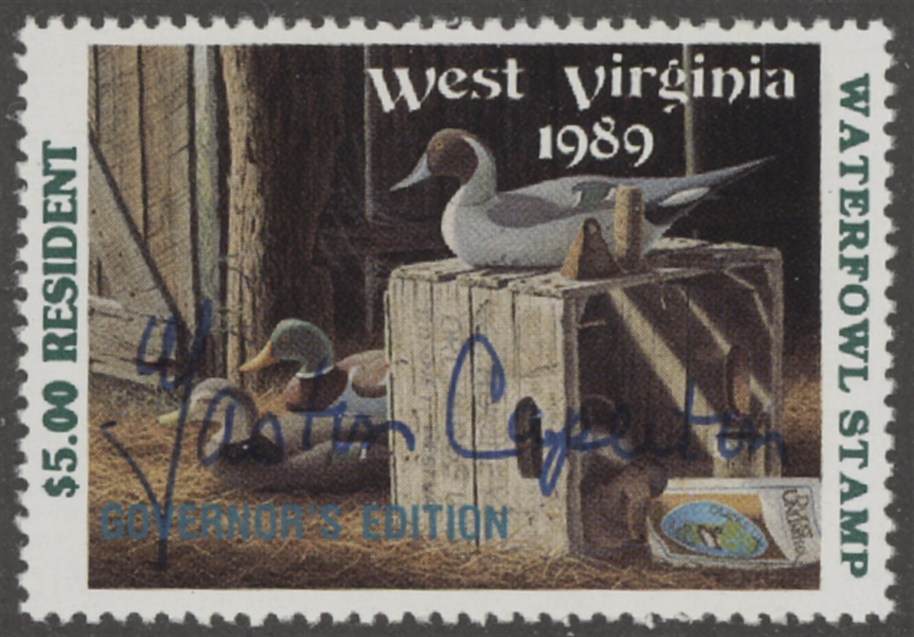 WV3GS 1989 State Duck Stamp. Mint Never Hinged, Hand Signed by Governor Gaston Caperton. Very Fine. Pintail Decoy by Ron Louque.