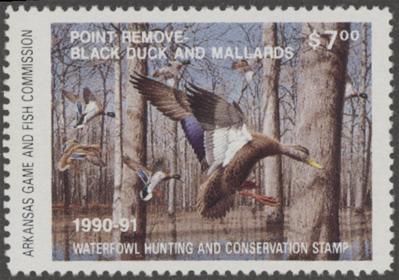 AR10 1990 State Duck Stamp. Mint Never Hinged. Very Fine. Black Duck and Mallards by John Cowan.