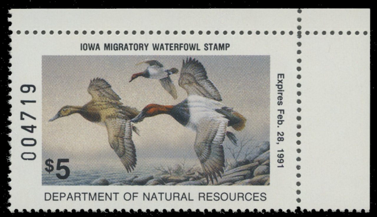 IA19 1990 State Duck Stamp. Mint Never Hinged. Very Fine. Canvasbacks by Patrick Murillo.