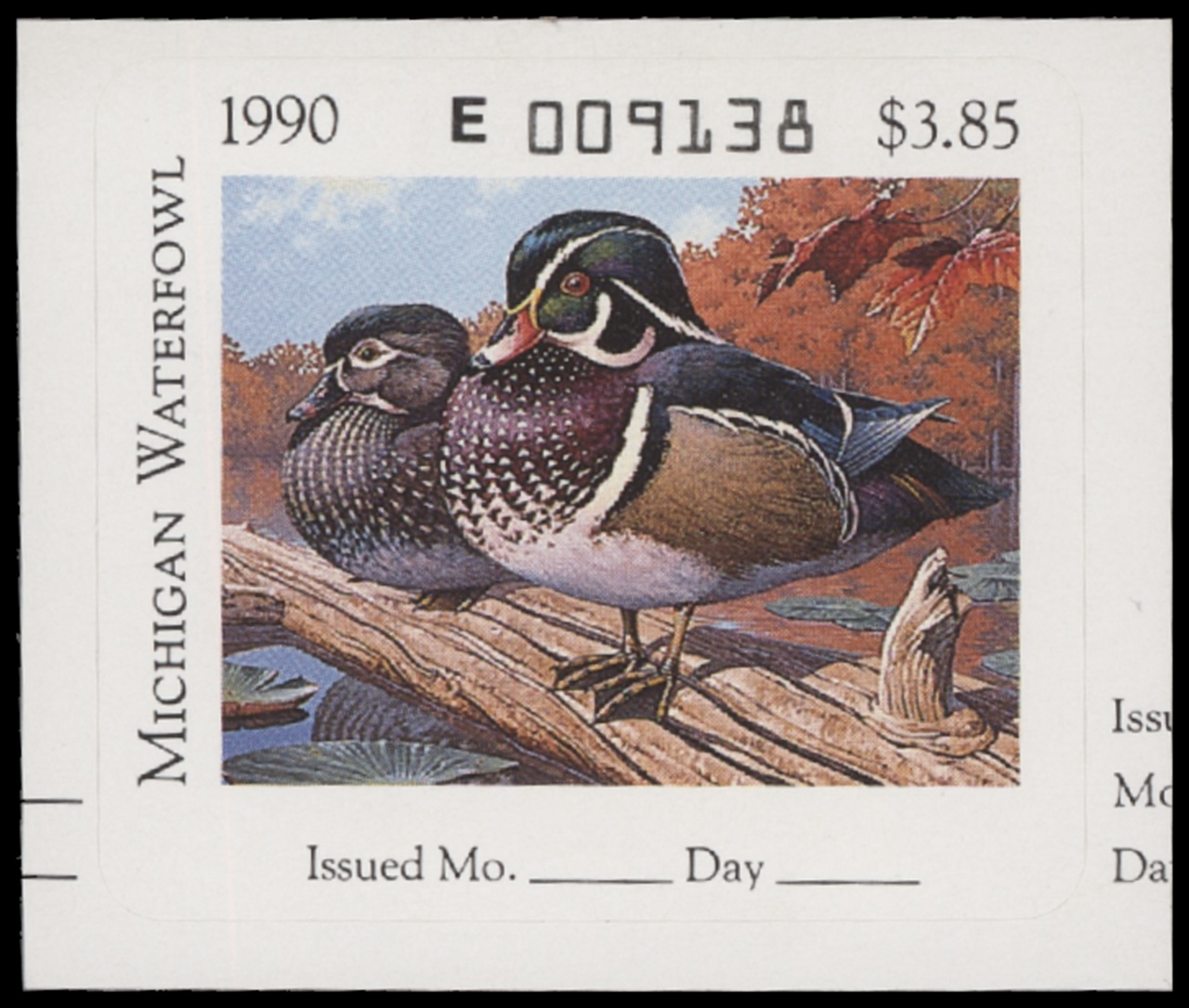 MI15 1990 State Duck Stamp. Mint Never Hinged. Very Fine. Wood Ducks by Rod Lawrence.