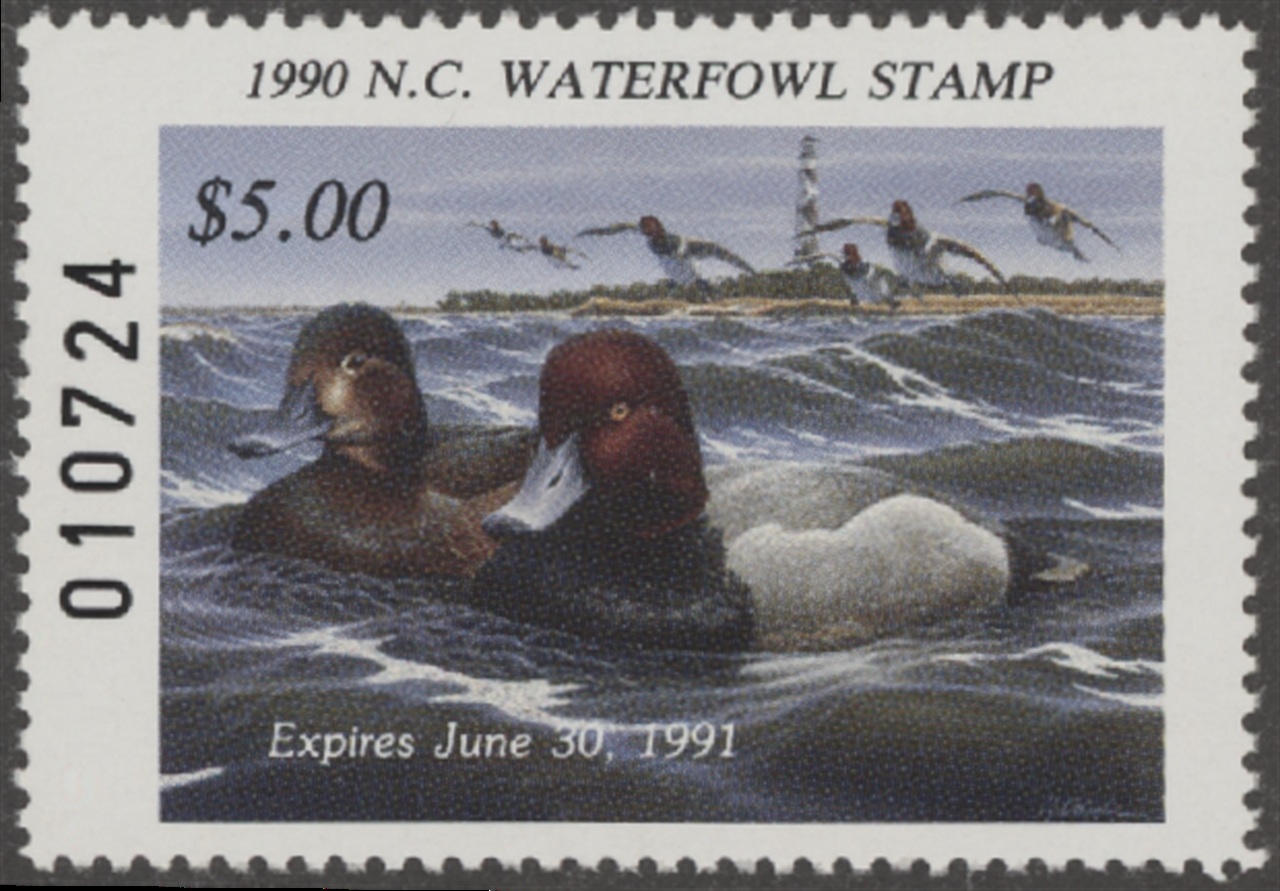 NC8 1990 State Duck Stamp. Mint Never Hinged. Very Fine. Redhead Ducks by Rob Leslie.