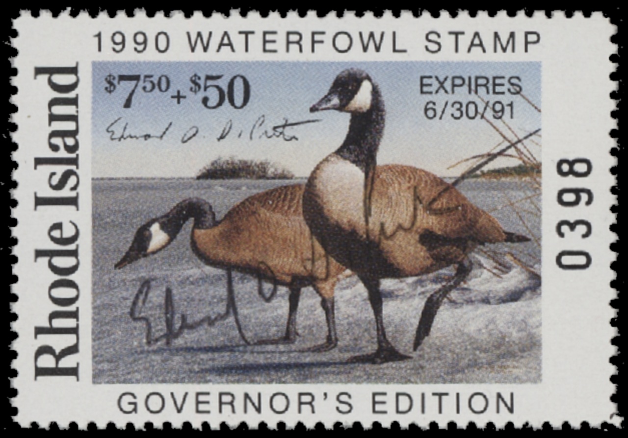 RI2GS 1990 State Duck Stamp Governor's Edition. Hand Signed by Governor Edward DiPrete. Mint Never Hinged. Very Fine. Canada Geese by Robert Steiner.