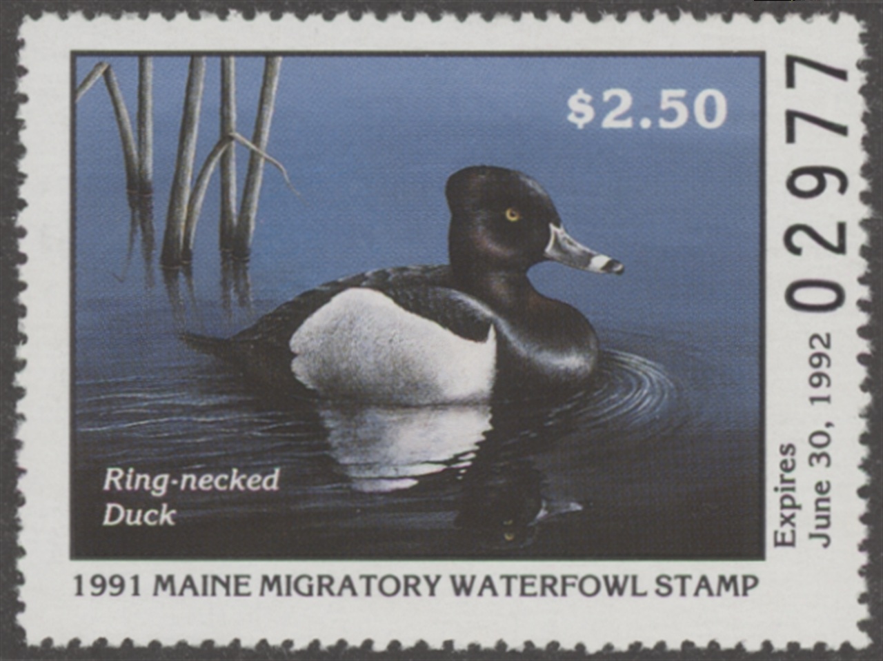 ME8 1991 State Duck Stamp. Mint Never Hinged. Very Fine. Ring-neck Duck by Patricia Carter.
