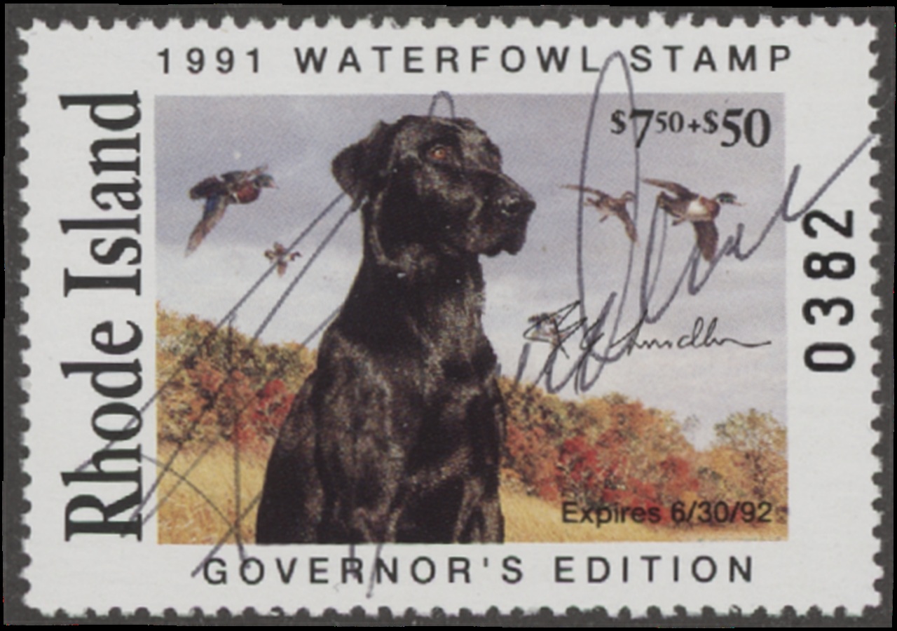 RI3GS 1991 State Duck Stamp. Mint Never Hinged, Hand Signed by Governor Bruce Sundlun. Very Fine. Black Lab by Robert Steiner.