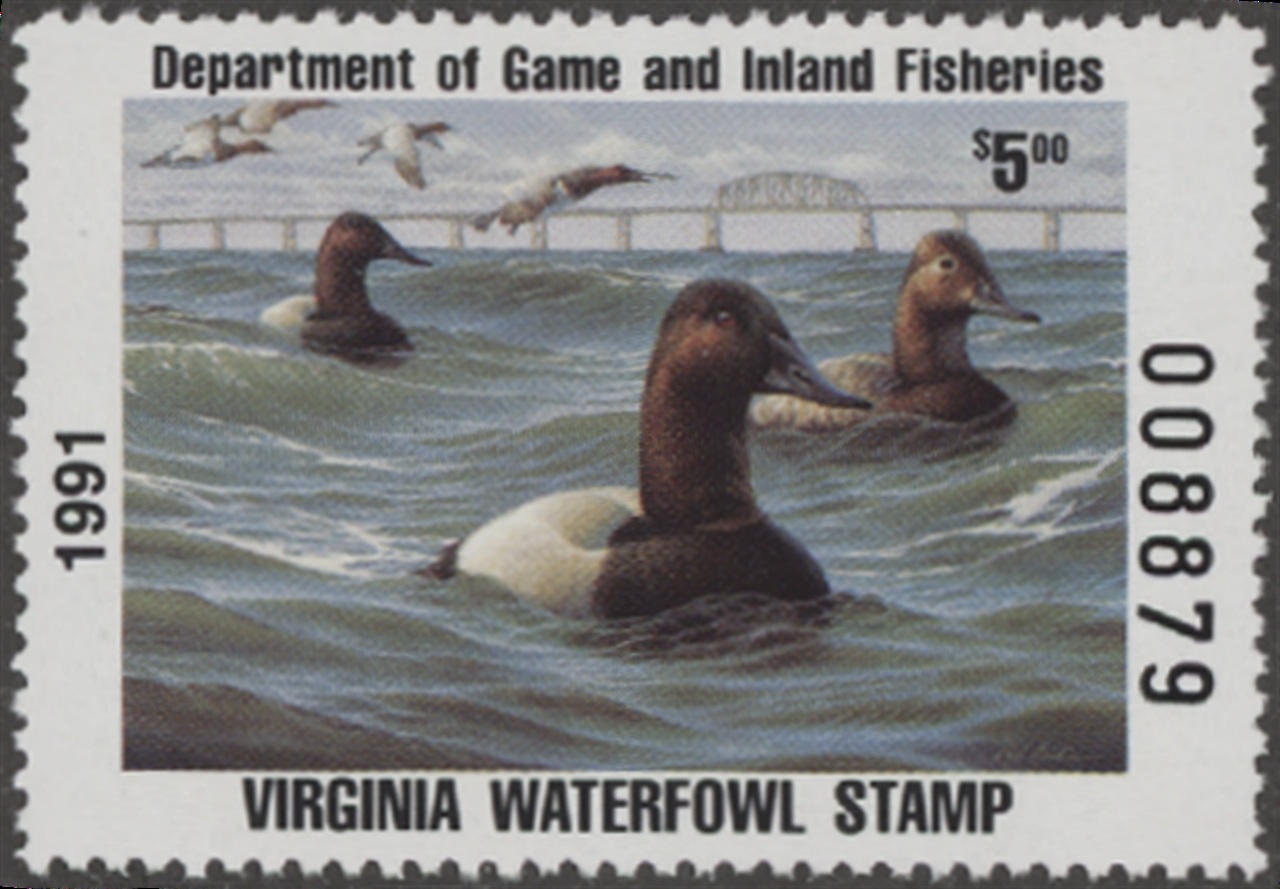 VA4 1991 State Duck Stamp. Mint Never Hinged. Very Fine. Canvasbacks by Rob Leslie.