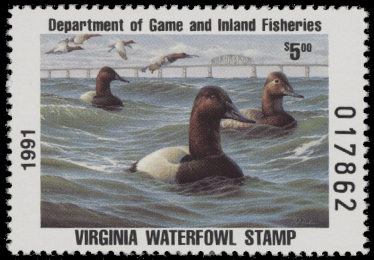 VA4 1991 State Duck Stamp. Mint Never Hinged. Very Fine. Canvasbacks by Rob Leslie.