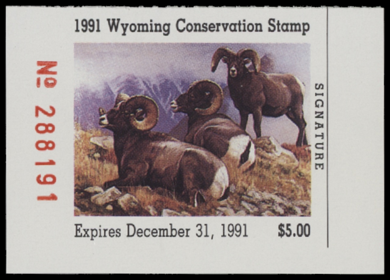 WY8 1991 State Duck Stamp. Mint Never Hinged. Very Fine. Bighorn Sheep by Dave Wade.