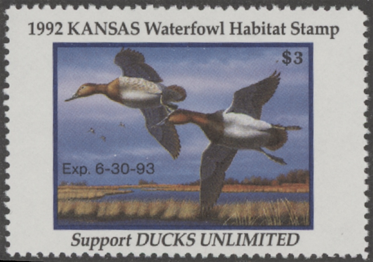 KS6 1992 State Duck Stamp. Mint Never Hinged. Very Fine. Canvasbacks by Jerry Thomas.