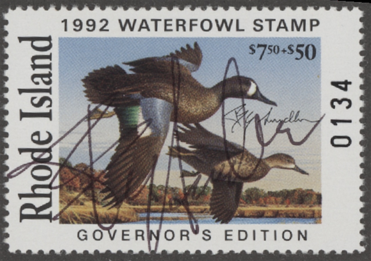 RI4GS 1992 State Duck Stamp. Mint Never Hinged, Hand Signed by Governor Bruce Sundlun. Very Fine. Blue-wing Teal by Robert Steiner.