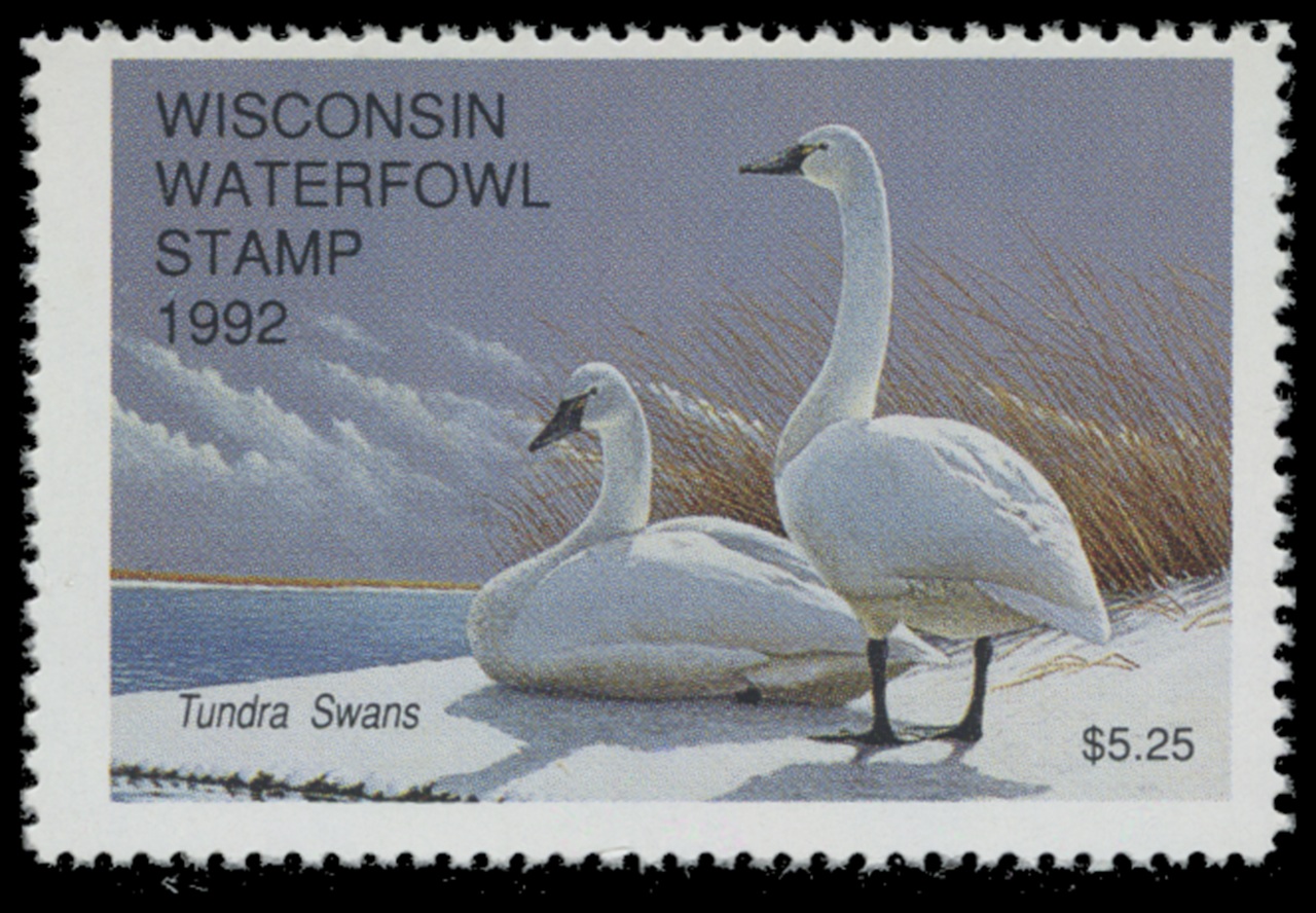 WI15 1992 State Duck Stamp. Mint Never Hinged. Very Fine. Tundra Swans by Michael Riddet.