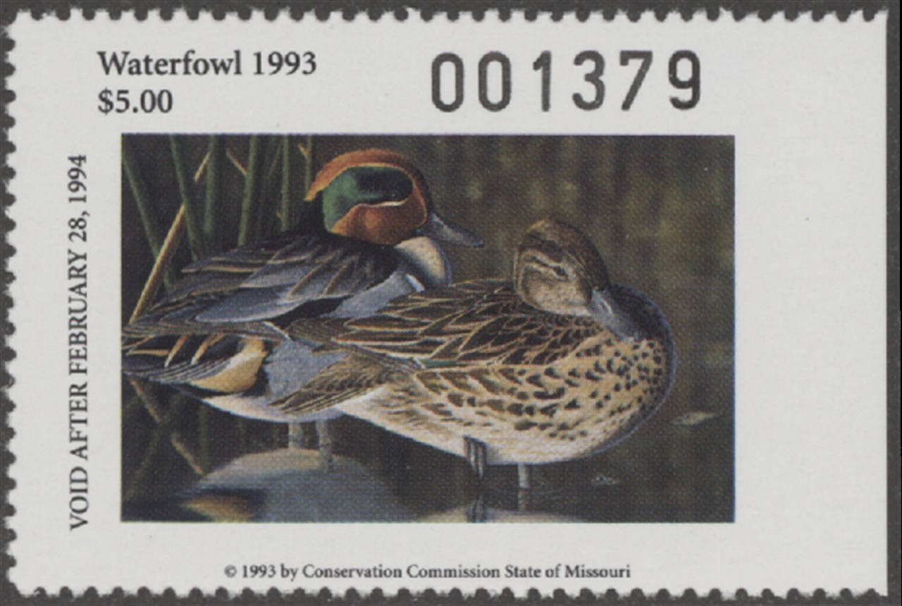 MO15 1993 State Duck Stamp. Mint Never Hinged. Very Fine. Green-winged Teal by Thomas Bates.