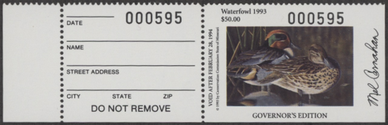 MO15HG 1993 State Duck Stamp Governor's Edition. Mint Never Hinged, Hunter Type with Tab. Very Fine. Green-wing Teal by Thomas Bates.