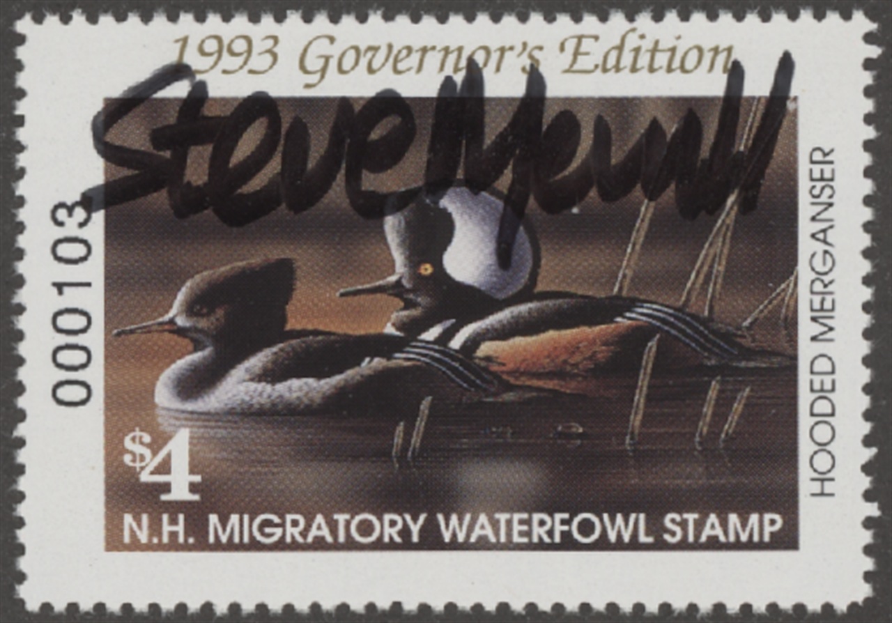 NH11GS 1993 State Duck Stamp. Mint Never Hinged, Hand Signed by Governor Steve Merrell. Very Fine. Hooded Mergansers by Richard Clifton.