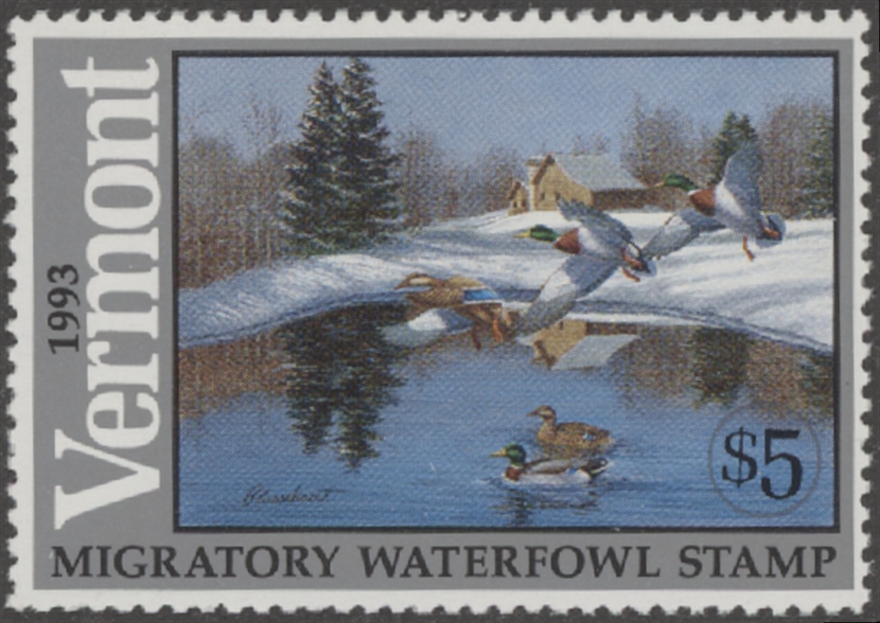 VT8 1993 State Duck Stamp. Mint Never Hinged. Very Fine. Mallards by Richard Plasschaert.