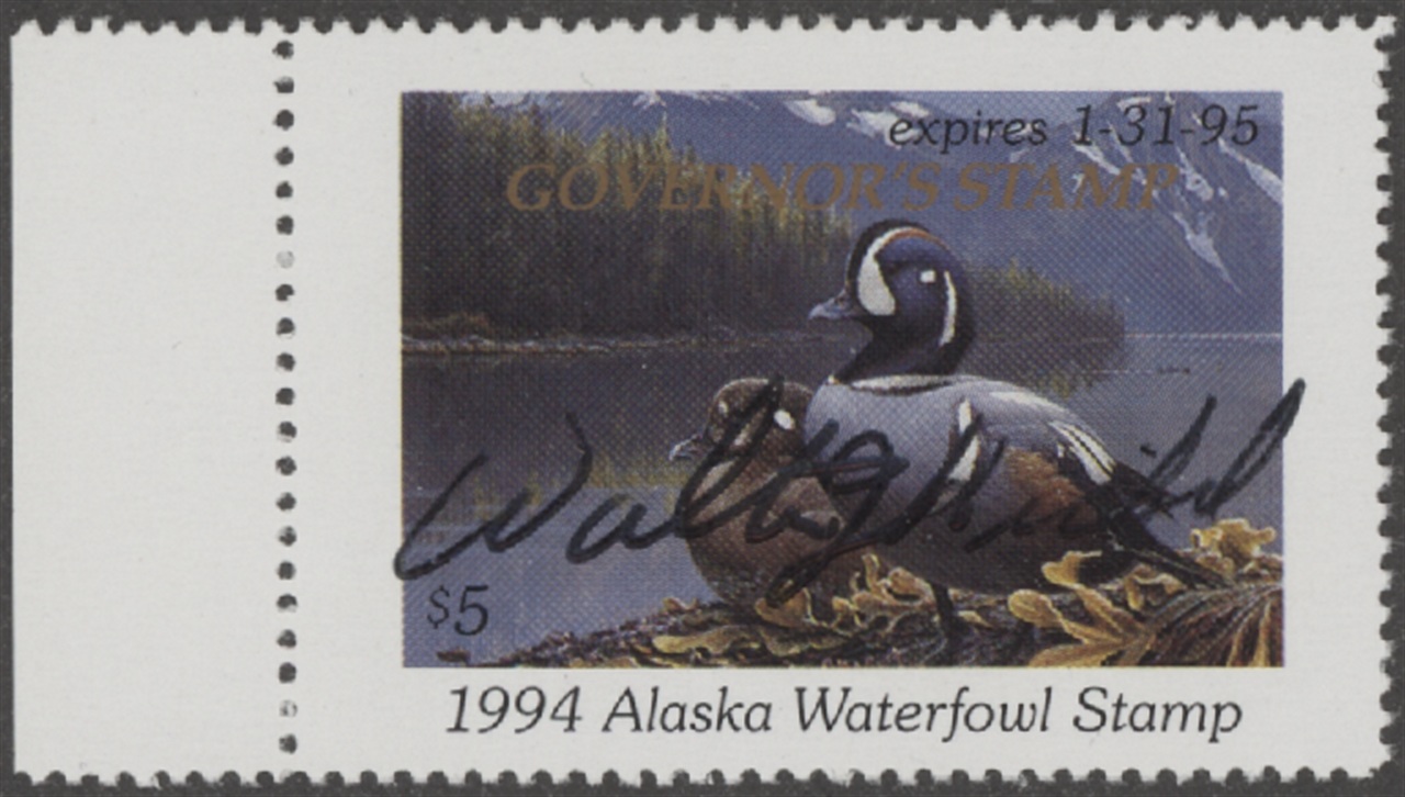 AK10GS 1994 State Duck Stamp Governor's Edition. Hand Signed by Governor Wally Hickel. Very Fine. Harlequin Ducks by George Lockwood.
