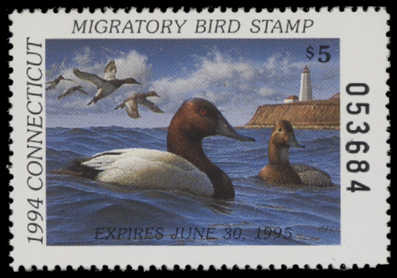 CT2 1994 State Duck Stamp. Mint Never Hinged. Very Fine. Canvasbacks by Rob Leslie.