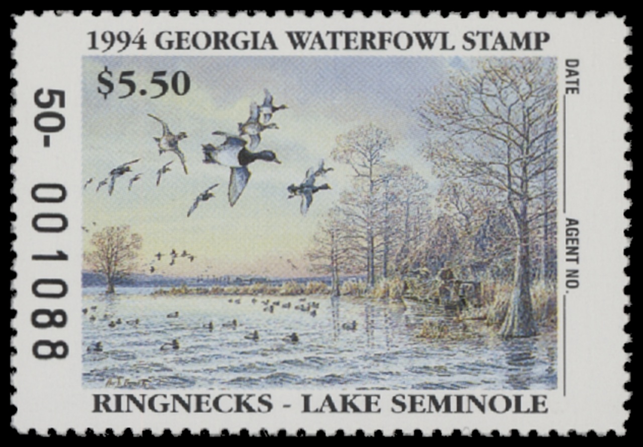 GA10 1994 State Duck Stamp. Mint Never Hinged. Very Fine. Ring-necked Ducks by Herb Booth.
