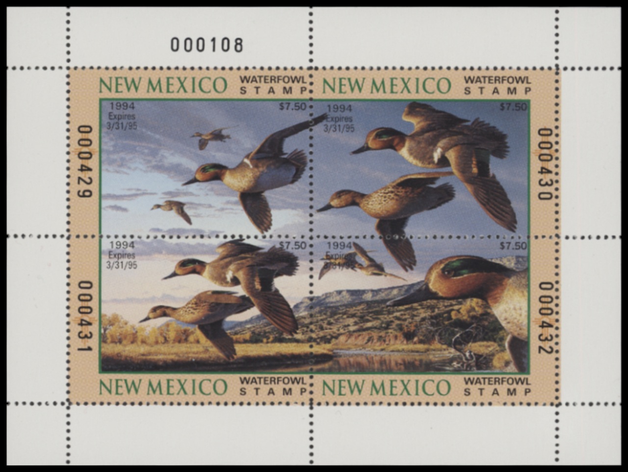 NM4 1994 State Duck Stamp. Mint Never Hinged. Very Fine. Green-winged Teal by Robert Steiner.