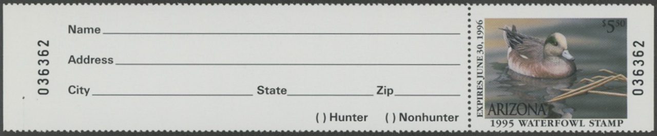 AZ9A 1995 State Duck Stamp Hunter Type. Mint Never Hinged. Very Fine. Wigeon by Sherrie Russell Meline.